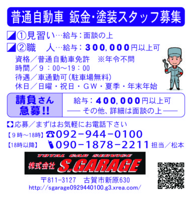 新宮・古賀・福津・久山版 【株式会社 S.GARAGE】普通自動車 鈑金・塗装スタッフ募集<見習い・職人・請負>