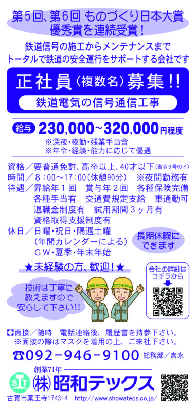 新宮・古賀・福津・久山版 【株式会社 昭和テックス】正社員募集!!<鉄道電気の信号通信工事>
