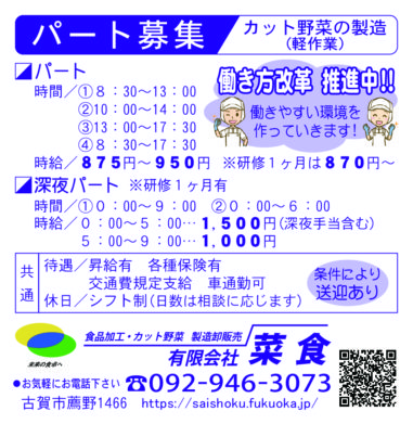 新宮・古賀・福津・久山版 【有限会社 菜食】パート募集<カット野菜製造の軽作業>