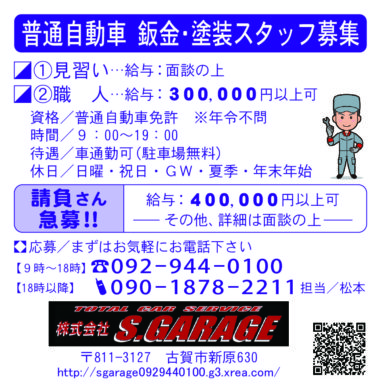 新宮・古賀・福津・久山版 【株式会社 S.GARAGE】普通自動車 鈑金・塗装スタッフ募集<見習い・職人・請負>