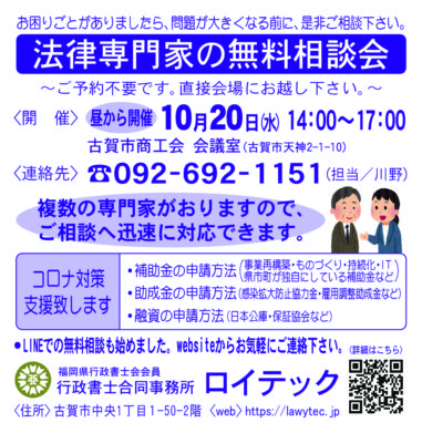 新宮・古賀・福津・久山版 【行政書士合同事務所 ロイテック】法律専門家の無料相談会<10/20(水)>