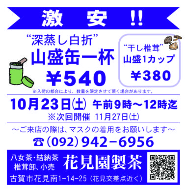 新宮・古賀・福津・久山版 【花見園製茶】激安!! 深蒸し白折 山盛缶一杯 540円〈10/23(土)〉