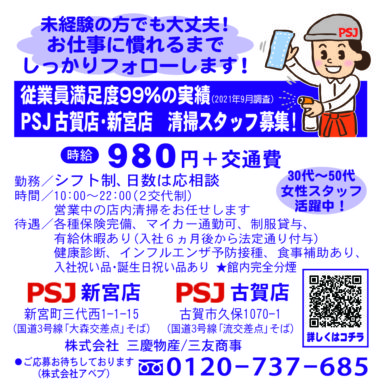 新宮・古賀・福津・久山版 【PSJ古賀店・新宮店】清掃スタッフ募集!