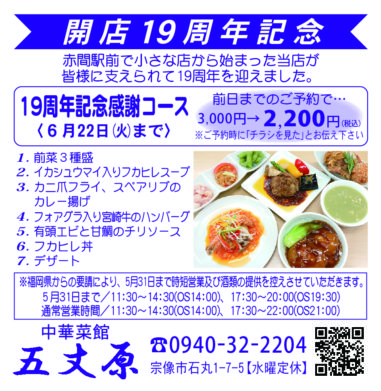 宗像・福津版 【中華菜館 五丈原】開店19周年記念感謝コース