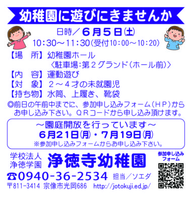 宗像・福津版 【浄徳寺幼稚園】幼稚園に遊びにきませんか〈6/5(土)〉