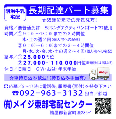 新宮・古賀・福津・久山版 【有限会社 メイジ東部宅配センター】長期配達パート募集<明治牛乳宅配>