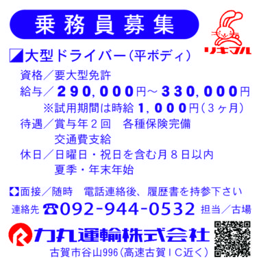 新宮・古賀・福津・久山版 【力丸運輸株式会社】乗務員募集<大型ドライバー(平ボディ)>