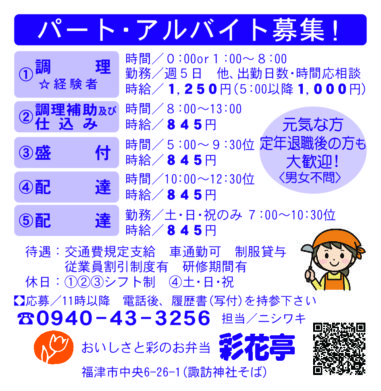 新宮・古賀・福津・久山版 【彩花亭】パート募集<調理経験者・調理補助及び仕込み・盛付・配達>
