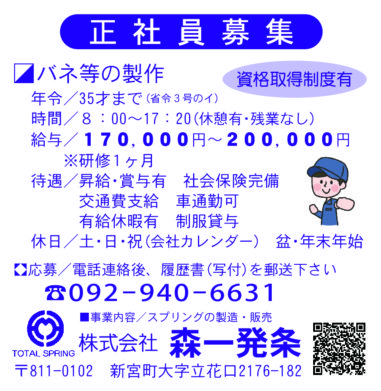 新宮・古賀・福津・久山版 【株式会社 森一発条】正社員募集<バネ等の製作>