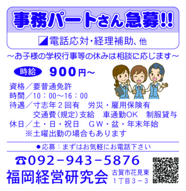 新宮・古賀・福津・久山版 【福岡経営研究会】事務パートさん急募!!