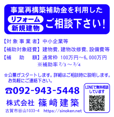 新宮・古賀・福津・久山版 【株式会社 篠﨑建築】事業再構築補助金を利用したリフォーム・新規建物、ご相談下さい!