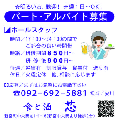 新宮・古賀・福津・久山版 【食と酒 芯】パート・アルバイト募集<ホールスタッフ>