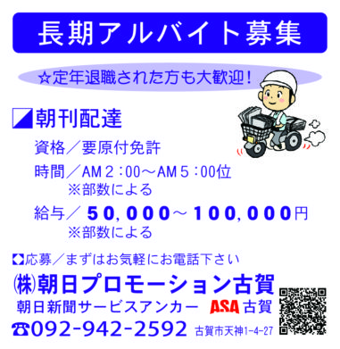 新宮・古賀・福津・久山版 【株式会社朝日プロモーション古賀】長期アルバイト募集<朝刊配達>